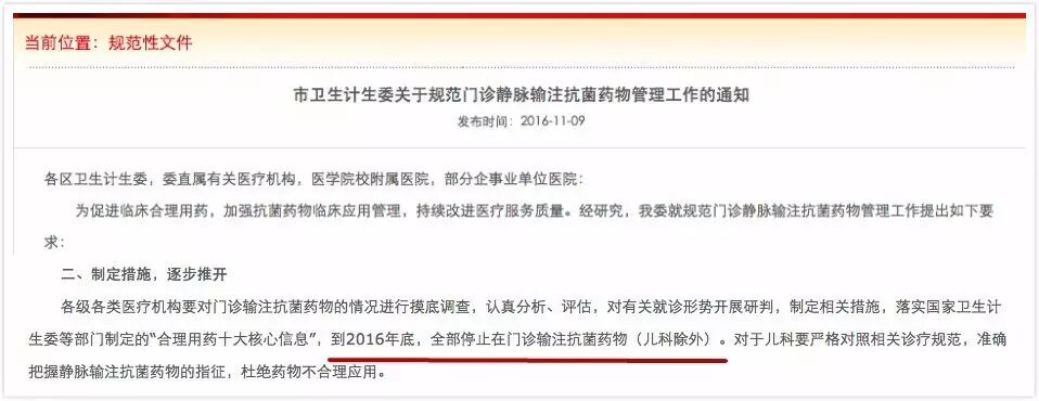 日前,天津市卫生计生委发文,要求在今年年底前,全市各级各类医疗机构全部停止门诊输注抗菌药物(儿科除外)。