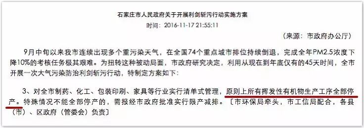 就在同一天,石家庄市政府发布的《关于开展利剑斩污行动实施方案》,要求全市所有制药企业全部停产, 未经市政府批准不得复工生产。