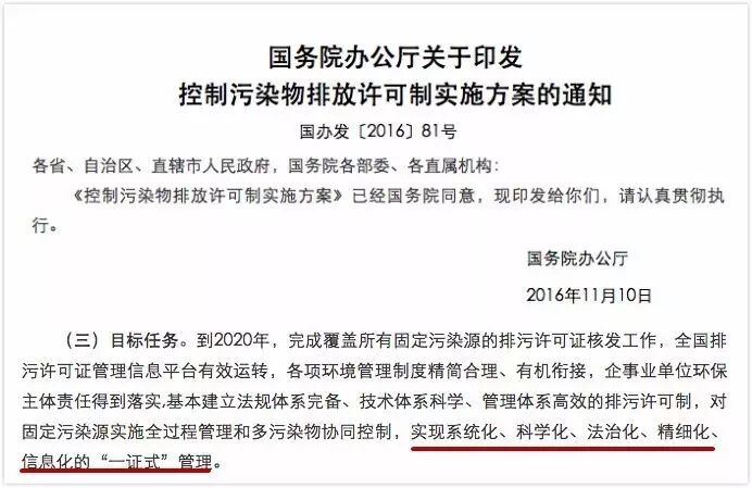 2016年11月21日,国务院办公厅下发《关于印发控制污染物排放许可制实施方案的通知》(简称“方案”,下同),“排污许可证“将实现系统化、科学化、法治化、精细化、信息化的“一证式”管理。