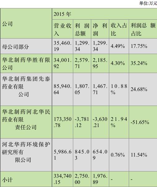 表1 华北制药涉及停产范围的主要单位 2015 年年度主要经营数据: