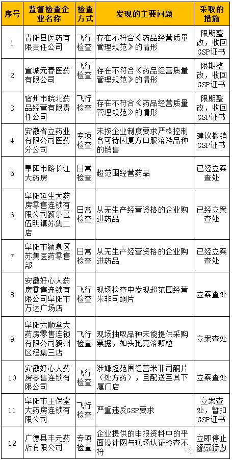 12月12日,安徽省药监局通告2016年11月药品流通监督检查信息,681家药企因存在相关问题,分别被处以收回GSP、立案查处、整改等处罚。