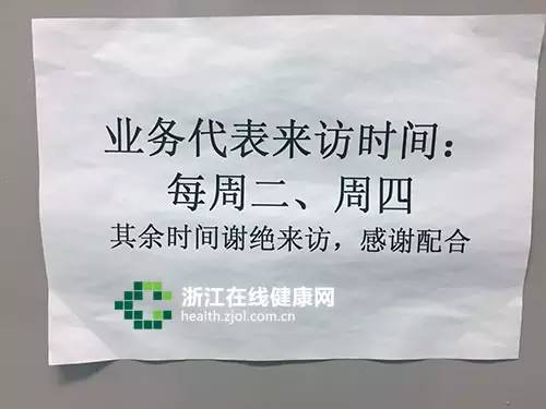 浙江省人民医院院区的东北角,是医院的药库,在这个鲜有人走的地方,入口处十分明显地贴着告示:“加强医疗卫生行风建设‘九不准’”,“业务代表来访时间:每周二、周四其余时间谢绝来访,感谢配合”。