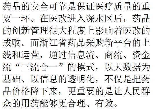 “这是一个信息流、商流、资金流,‘三流合一’的网上药品采购交易平台。”浙江省卫生计生委药政处相关负责人表示,新平台上药品货款的及时结算可以保证药品供应,而医疗机构与药品中标企业的量价挂钩、成交确认的价格谈判,也为未来医保的支付标准提供了数据基础。