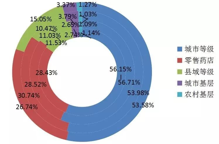 中康CMH数据显示,GSK产品在城市等级的占比呈小幅度下降趋势。随着基层首诊、分级诊疗等基层医改政策的不断推进深入,处方外流入基层医院以及零售药店,县域医院终端的市场潜力强大,各大外企纷纷将渠道下沉,预计2016年GSK在县域等级医院的规模将有所增加。