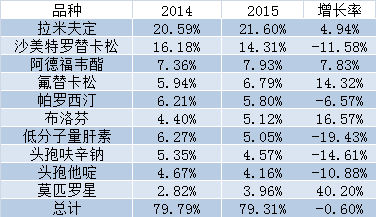 2015年GSK终端销售前10产品中有5个处于增长,5个处于下降趋势,前10产品占据了公司内部终端年销售额的79%,相比2014年仅下降了0.6%。下面针对重点品种进行分析。