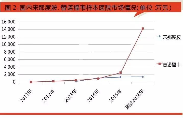 据国内样本医院数据统计,替诺福韦2012年销售额为242万元,2014年销售额为938万元,2015年销售额为2509万元,较同期增长167%,2016年前三季度销售额已高达8002万元,增长迅猛。该产品快速增长主要得益于2016年5月20日国家药品价格谈判结果,替诺福韦月均药品费用从1500元降至490元,降幅67%,成为全球治疗慢性乙肝适应症最低价,此举客观上推动了2016年替诺福韦市场上量,必将导致抗乙肝药物市场变局。