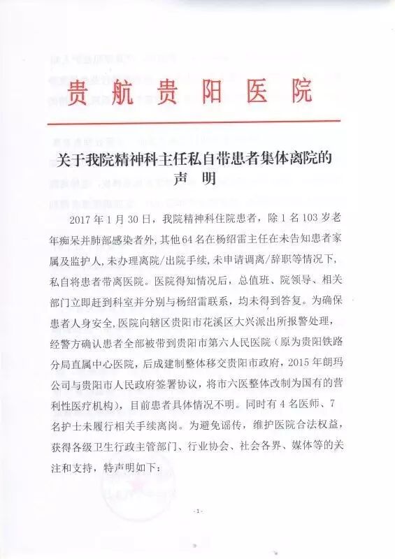 2月4日,贵阳市贵航贵阳医院在其官网发布《关于我院精神科主任私自带患者集体离院的声明》。消息一出,引发各方关注。声明如下: