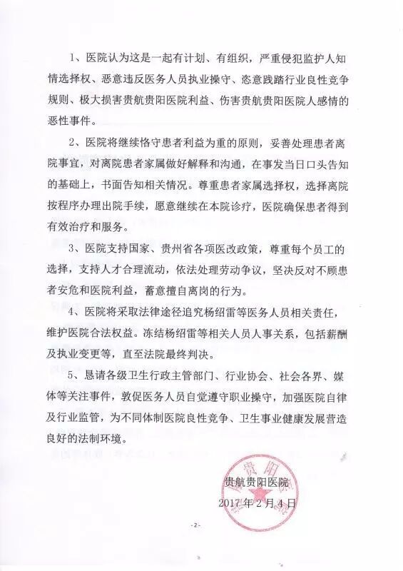 上述声明称,贵航贵阳医院精神科主任杨绍雷和4名医师、7名护士未履行手续集体离岗;科室65名患者中,有64名患者也在未办理出院(离院)手续的情况下,被该科室主任带离。院方认为,擅自离职的医护人员违背了医护职业操守,相关医院存在不良竞争。