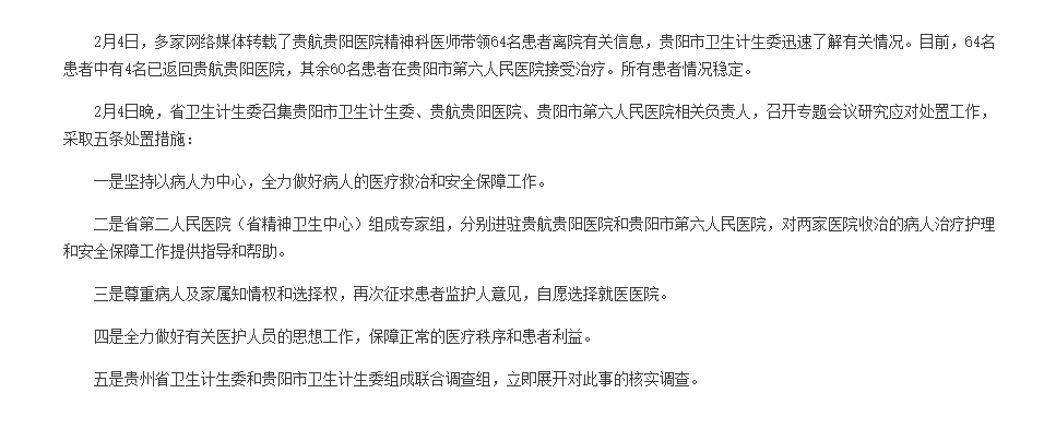 对此,贵阳市卫计委于2月5日晨通过其官网刊载了对事件的详细回应。回应中称,“目前64名患者中有4名已返回贵航贵阳医院,其余60名患者在贵阳市第六人民医院接受治疗。所有患者情况稳定。”