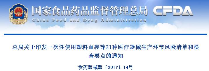 为增强医疗器械监管人员的风险识别能力,提升医疗器械生产监管风险防控水平,根据《医疗器械监督管理条例》(国务院令650号)、《医疗器械生产监督管理办法》(国家食品药品监督管理总局令第7号)、《医疗器械生产质量管理规范》(国家食品药品监督管理总局公告2014年第64号)及其配套文件,食品药品监管总局组织制定了《一次性使用塑料血袋等21种医疗器械生产环节风险清单和检查要点》(以下简称《风险清单和检查要点》),现予印发。