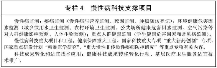 2.推动科技成果转化和适宜技术应用。系统加强慢性病防治科研布局,推进相关科研项目。进一步加强国家临床医学研究中心和协同创新网络建设,完善重大慢性病研究体系。以信息、生物和医学科技融合发展为引领,加强慢性病防治基础研究、应用研究和转化医学研究。统筹优势力量,推进慢性病致病因素、发病机制、预防干预、诊疗康复、医疗器械、新型疫苗和创新药物等研究,重点突破精准医疗、“互联网+”健康医疗、大数据等应用的关键技术,支持基因检测等新技术、新产品在慢性病防治领域推广应用。针对中医药具有优势的慢性病病种,总结形成慢性病中医健康干预方案并推广应用。结合慢性病防治需求,遴选成熟有效的慢性病预防、诊疗、康复保健适宜技术,加快成果转化和应用推广。开展慢性病社会决定因素与疾病负担研究,探索有效的慢性病防控路径。在专业人才培养培训、信息沟通及共享、防治技术交流与合作、能力建设等方面积极参与国际慢性病防治交流与合作。