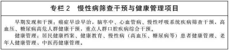 1.促进慢性病早期发现。全面实施35岁以上人群首诊测血压,发现高血压患者和高危人群,及时提供干预指导。社区卫生服务中心和乡镇卫生院逐步提供血糖血脂检测、口腔预防保健、简易肺功能测定和大便隐血检测等服务。逐步将临床可诊断、治疗有手段、群众可接受、国家能负担的疾病筛检技术列为公共卫生措施。在高发地区和高危人群中逐步开展上消化道癌、宫颈癌等有成熟筛查技术的癌症早诊早治工作。加强健康体检规范化管理,健全学生健康体检制度,推广老年人健康体检,推动癌症、脑卒中、冠心病等慢性病的机会性筛查。将口腔健康检查纳入常规体检内容,将肺功能检查和骨密度检测项目纳入40岁以上人群常规体检内容。