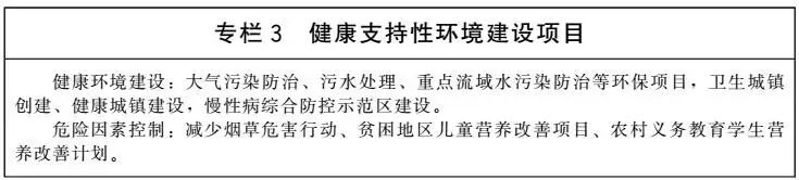 1.建设健康的生产生活环境。推动绿色清洁生产,改善作业环境,严格控制尘毒危害,强化职业病防治,整洁城乡卫生,优化人居环境,加强文化、科教、休闲、健身等公共服务设施建设。建设健康步道、健康主题公园等运动健身环境,提高各类公共体育设施开放程度和利用率,推动有条件的学校体育场馆设施在课后和节假日对本校师生和公众有序开放,形成覆盖城乡、比较健全的全民健身服务体系,推动全民健身和全民健康深度融合。坚持绿色发展理念,强化环境保护和监管,落实大气、水、土壤污染防治行动计划,实施污染物综合控制,持续改善环境空气质量、饮用水水源水质和土壤环境质量。建立健全环境与健康监测、调查、风险评估制度,降低环境污染对健康的影响。