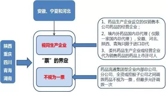 在业内广为流传的国家版《在公立医疗机构药品集中采购中推行“两票制”的实施意见(试行)征求意见稿》中,对于“票”的界定为:药品生产企业或科工贸一体化的集团型企业设立的仅销售本企业(集团)药品的全资或控股商业公司、境外药品国内总代理可视同生产企业,但仅限 1 家商业公司、1 家国内总代理,且加价须控制在一定范围内。药品流通集团型企业内部向全资或控股子公司调拨药品可不视为一票,但最多允许开一次发票,且加价须控制在一定范围内。 具体规定由各省(区、市)制定。