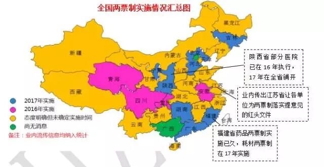 目前,在全国31个省份中(除港、澳、台),福建(药品)执行两票制已久,安徽、四川、青海、重庆4省在2016年实施两票制,还有福建(耗材)、宁夏等7省将于今年正式拉开“两票制”大幕(陕西省部分医院已在16年执行),江苏在业内流传征求意见,广西和北京暂无消息,剩余海南、湖北、山西等17个省份已表明态度但尚未确定落实时间。