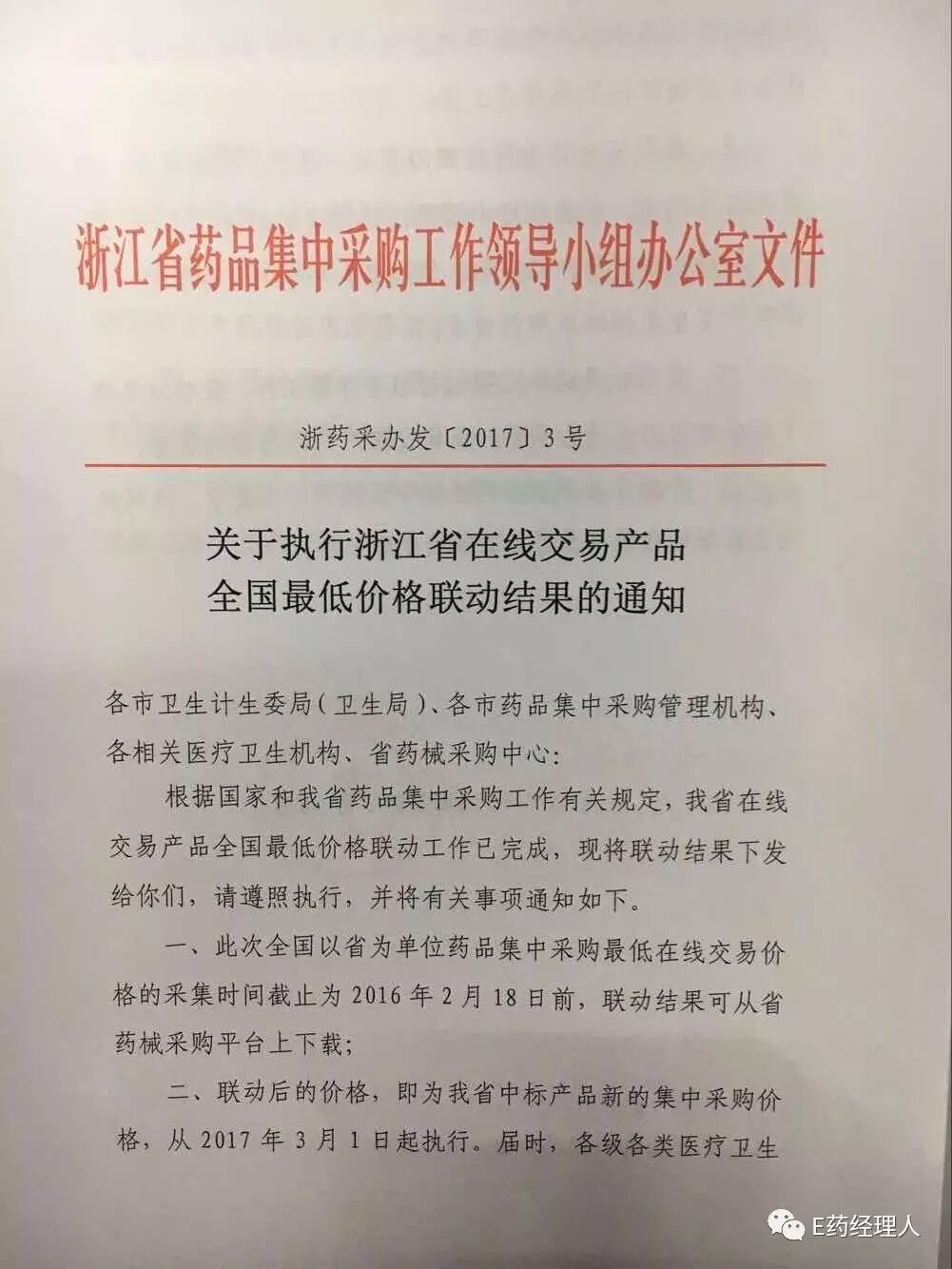 2017年2月21日,浙江省药械采购中心公布了《关于执行浙江省在线交易产品全国最低价格联动结果的通知》,公布了8290种药品的全国最低价联动结果,不过产品的价格已经低于企业预期。放弃还是接受,将是企业需要考虑的首要问题。