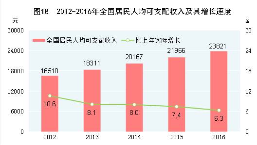 全年全国居民人均可支配收入23821元,比上年增长8.4%,扣除价格因素,实际增长6.3%;全国居民人均可支配收入中位数20883元,增长8.3%。按常住地分,城镇居民人均可支配收入33616元,比上年增长7.8%,扣除价格因素,实际增长5.6%;城镇居民人均可支配收入中位数31554元,增长8.3%。农村居民人均可支配收入12363元,比上年增长8.2%,扣除价格因素,实际增长6.2%;农村居民人均可支配收入中位数11149元,增长8.3%。按全国居民五等份收入分组,低收入组人均可支配收入5529元,中等偏下收入组人均可支配收入12899元,中等收入组人均可支配收入20924元,中等偏上收入组人均可支配收入31990元,高收入组人均可支配收入59259元。贫困地区农村居民人均可支配收入8452元,比上年增长10.4%,扣除价格因素,实际增长8.4%。全国农民工人均月收入3275元,比上年增长6.6%。