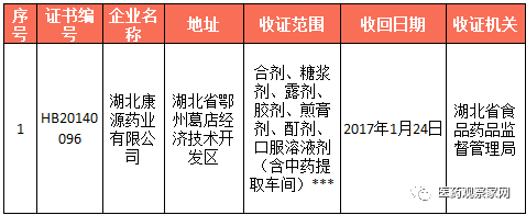 湖北康源药业有限公司严重违反《药品生产质量管理规范》规定,依据《药品生产质量管理规范认证管理办法》第三十三条规定,该局依法收回其《药品GMP证书》。