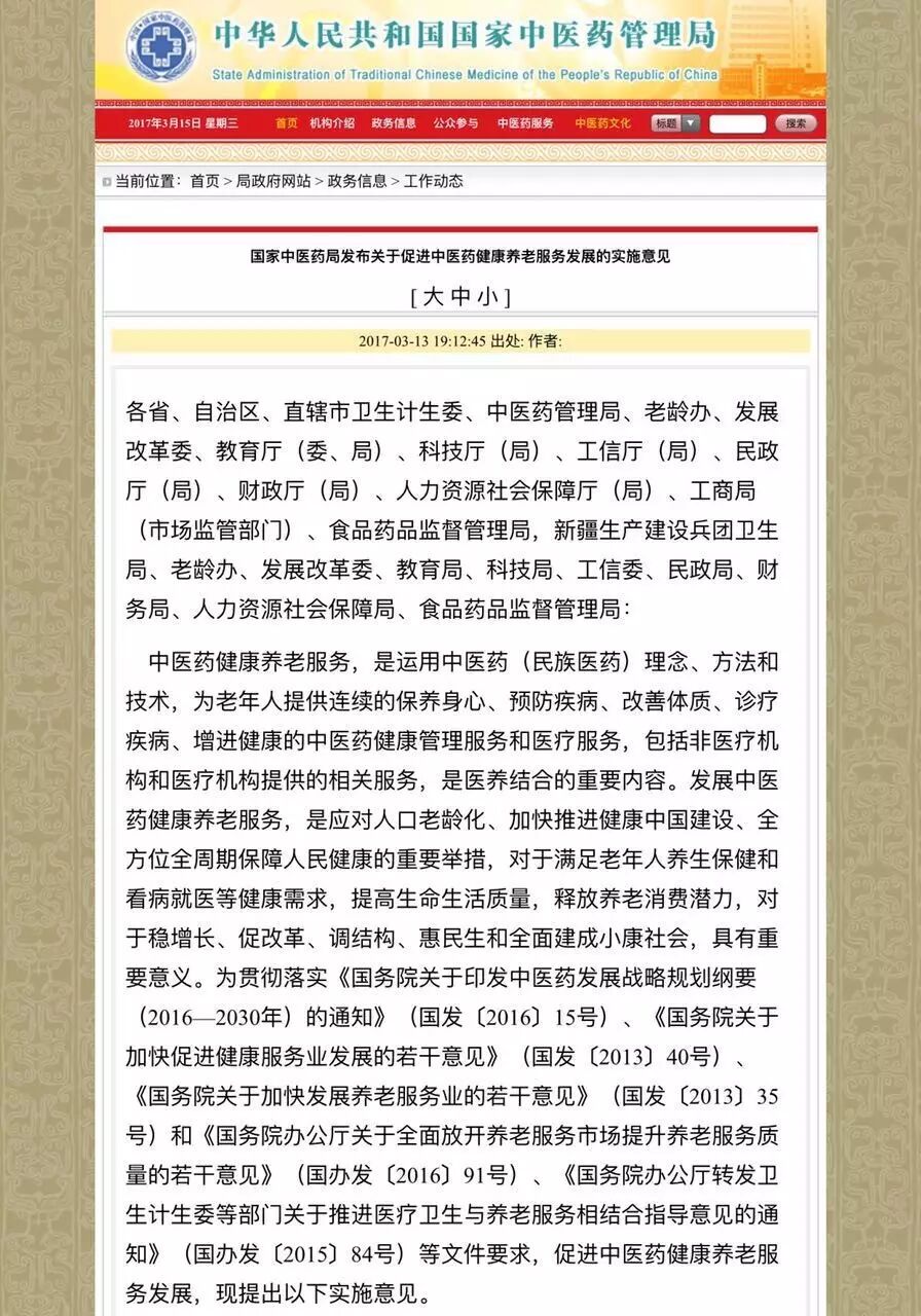 3月13日,国家中医药局发布了《关于促进中医药健康养老服务发展的实施意见》,为接下来的中医药发展划出了重点。意见要求,中医医院与养老机构合作,到2020年超60%的养老机构要有中医药服务。不仅如此,接下来,“二级以上中医医院普遍设置治未病科室。”