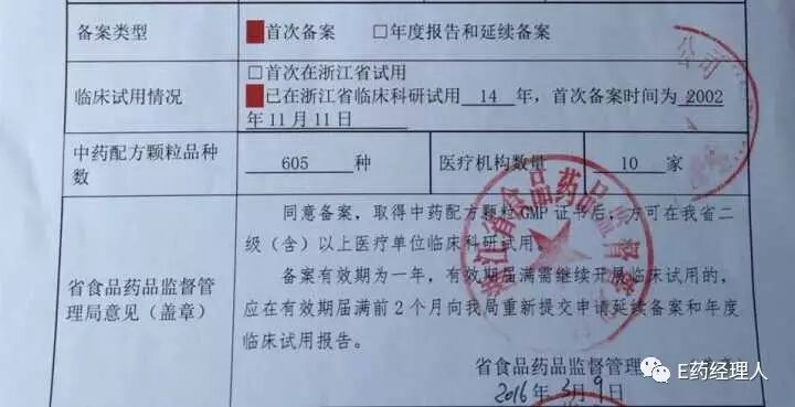图:2016年《浙江省中药配方颗粒临床试用备案表》