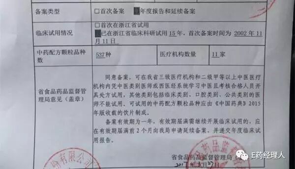 图:2017年《浙江省中药配方颗粒临床试用备案表》