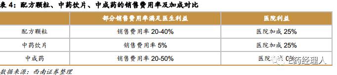 而在政策层面,与中成药相比,中药配方颗粒按照中药饮片管理,不取消药品加成、不计入药占比,保留政策红利。如果与中药饮片对比,中药配方颗粒销售费用率约20%~40%(而中药饮片销售费率约5%)很大程度满足医生利益诉求;相对于中成药,中药配方颗粒加成约25%(而中成药将取消15%的加成)、不占药占比,更大程度上满足医院利益诉求。