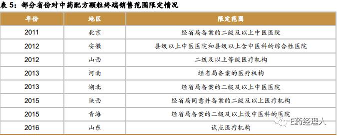根据卫计委统计,中国二级以上中医院数量为1997家,中医院为3115家,中药配方颗粒在中医院的覆盖率不超过65%;而具备中医科室的中医院、中西医结合医院与综合医院共计20023家,依此计算则中药配方颗粒在具备中医科室的医院覆盖面不超过10%。从这个角度来说,市场空间还很大。