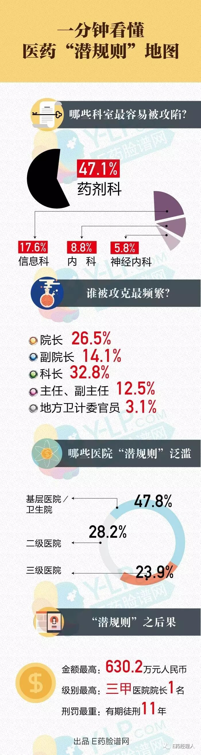 什么科室高危?从“沦陷”的科室比例来看,药剂科“理所当然”的排在了首位。在E药经理人对2016年至2017年中国裁判文书网目前已公布的医药代表相关案件信息的统计中,有47.1%的案件涉及药剂科。这也并不难理解,在医院中,药剂科万网负责制定医院基本用药目录,编制药品计划,在相当大的程度上决定着一个药品能否进入该医院。也正因此,不管是主任一级的领导层,还是具体的工作人员,都成为了药品销售人员的重点关注对象,甚至连库房管理员,也是不得不拉拢的对象。例如镇江市丹徒区某医院药剂科,一名中药库房管理员便因为收受医药代表9.13万元的贿赂,被判处有期徒刑一年,并处罚金十万元人民币。