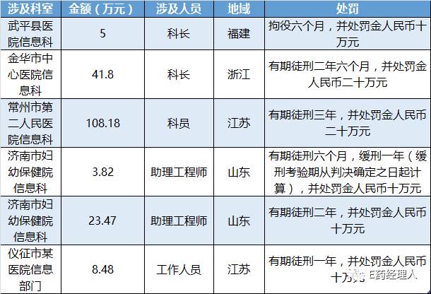 医药代表为何会栽在打单上?E药经理人统计了从2014年至今全国关于医药代表行贿医生被判决的243例案件,其中医院的信息科占比达到17.6%,仅次于药剂科,正在朝着“重灾区”的方向演进。在医院日益对科室工作人员进行统方要求日益严格的情况下,信息科成为了最具备“统方”便利条件的科室,此前也有过关于医院信息科工作人员将相关统方信息进行售卖从而获利百余万的案例报道。