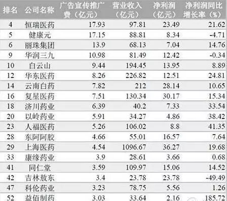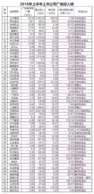 东方财富网此前一组公开数据显示,在 “2016年上半年上市公司广告投入榜”上,在广告投入排名前55位的上市公司中,恒瑞医药、健康元、丽珠集团、华润三九、白云山等19家医药企业位列其中。