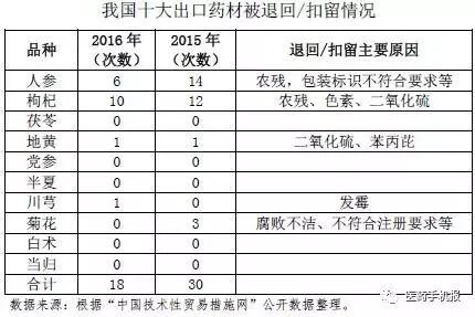 2016年,我国出口药材整体质量明显提升。其中,2016年出口额排名前10的品种,因质量等问题被日本、美国、欧盟、韩国扣留或退回18次,比2015年的30次下降40%。