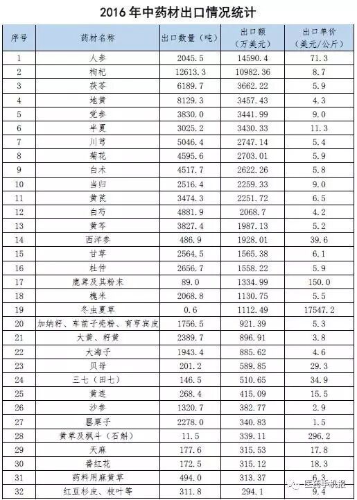 我国中药材资源丰富,出口中药材及饮片品种达数百种。2016年,出口金额和出口数量较多的品种依然以滋补养生类为主。