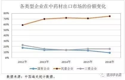 近年来,国有企业在中药材及饮片出口市场中所占份额逐年下降,民营企业所占份额持续上升。2016年,民营企业市场份额为75%,同比上升4个百分点;国有企业市场份额跌落至9%,同比下降4个百分点;三资企业市场份额为16%,与2015年基本持平。