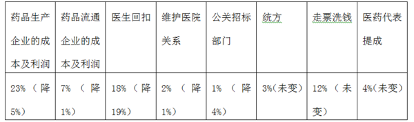 所以,平均降价30%后,医生的回扣下降了19%,药品生产企业和流通企业的成本和利润均下降了1%,维护医院关系费下降了1%,公关招标部门的费用下降了4%,这些都是詹积富的功劳。但是,统方3%,走票洗钱12%,医药代表4%,这些是刚性支出,无法减少。