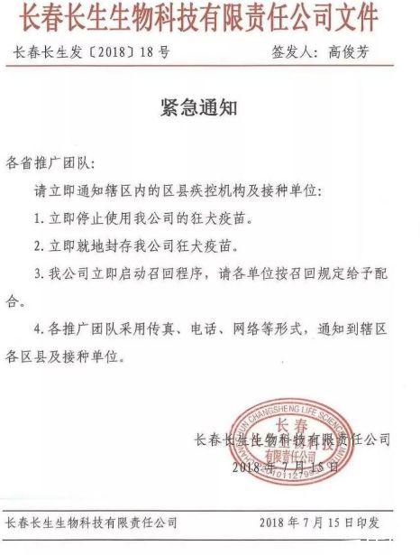 7月15日下午,一份长春长生的内部文件在网络上流传。该文件由长生生物董事长高俊芳签发,为保证用药安全,长春长生正对有效期内所有批次的冻干人用狂犬病疫苗(Vero细胞)全部实施召回。长生生物工作人员表示,对有效期内全部产品的召回是长生生物自主行为,并不是国家药监局的要求。