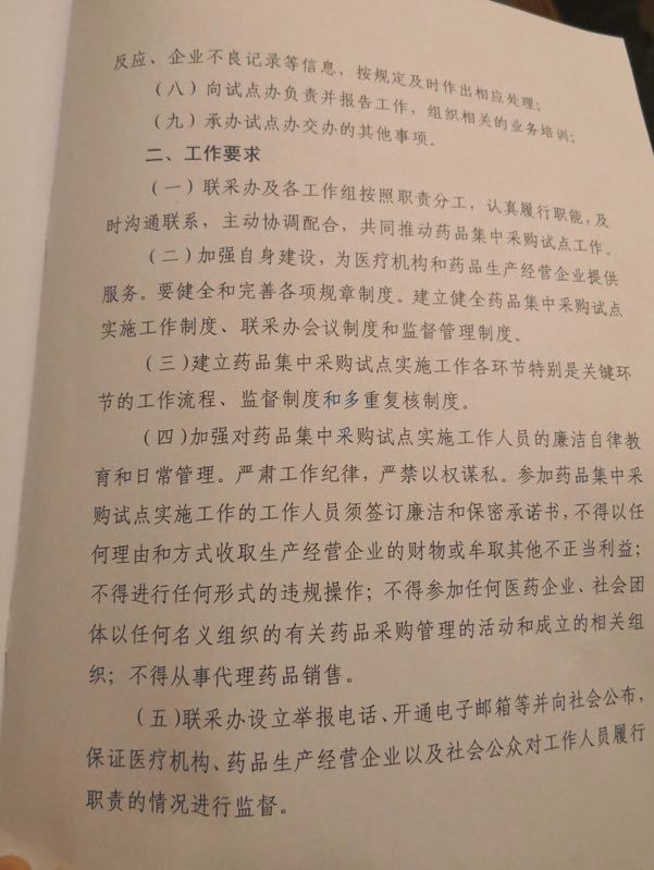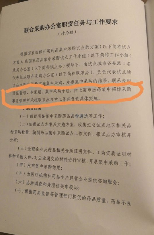 讨论稿表示,根据国家组织开展药品集中采购试点的方案,在国家药品集中采购试点工作小组及其办公室的领导下试点城市(参加会议省、市确定)各委派一名代表组成联采办公室,内设监督组、专家组、集中采购小组。由上海医药集中招标采购事务管理所承担日常工作并负责具体实施。