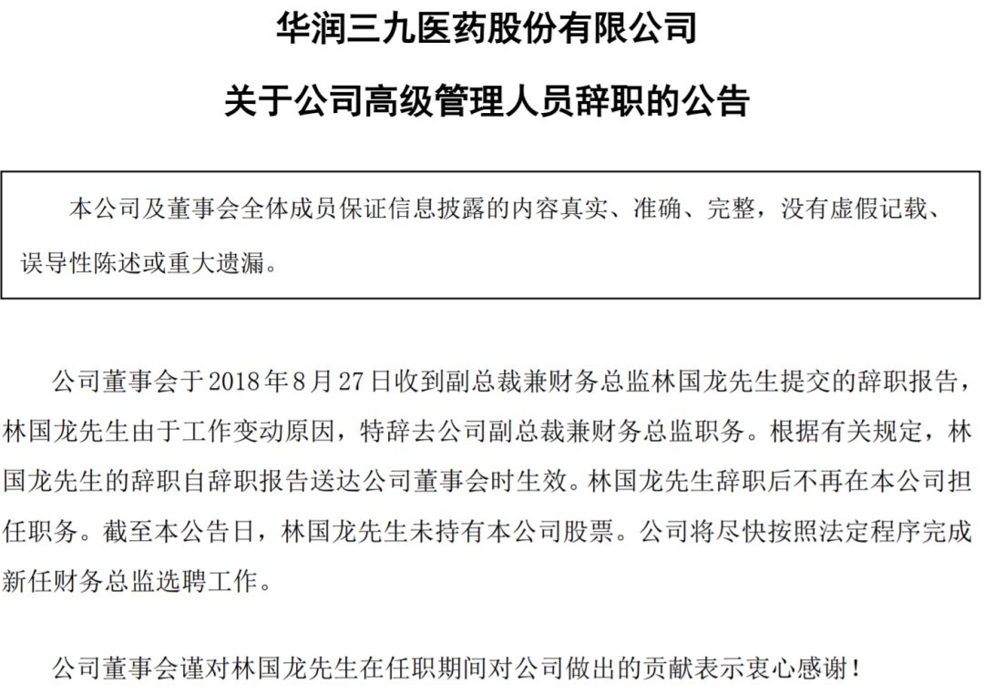 华润三九董事长和财务总监双双辞职,从新一届任期计算,刚好4个月。