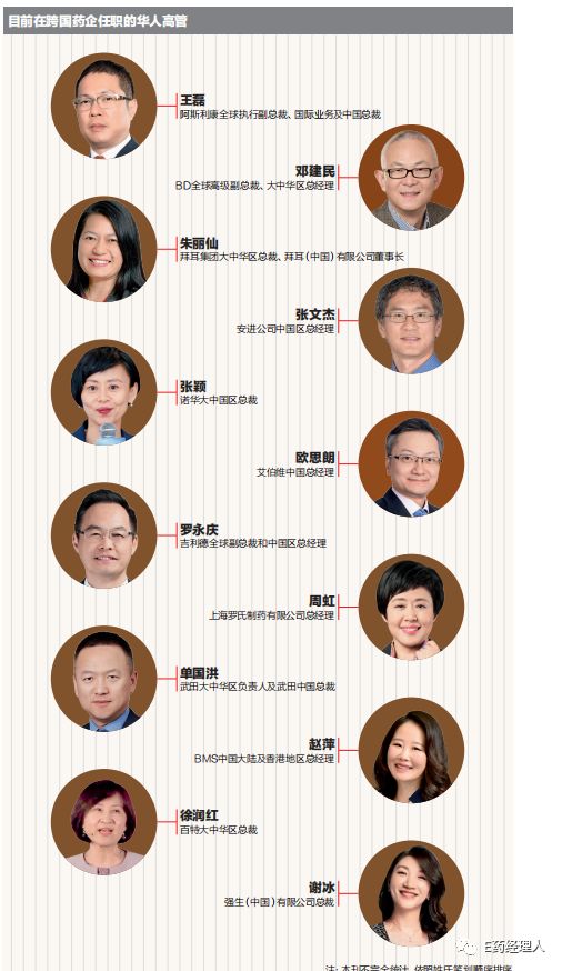时至今日,越来越多的跨国药企选择华裔或者本土成长起来的职业经理人担任中国区负责人。根据统计,目前跨国药企在中国的最高负责人大多数皆由本土制药管理人才担任,其中2017年跨国药企业绩排行榜前10名中有6家的中国区最高负责人由华人职业经理人担任。这其中包括强生、诺华和罗氏等知名跨国药企,也充分表明了跨国药企管理层对于华人高管在中国市场上能力的肯定。