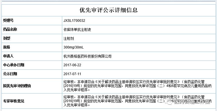依库珠单抗注射液由瑞士Alexion公司研发,由杭州泰格医药科技股份有限公司代理申报进口注册。基于该产品属于临床急需品种,国家药监局药品审评中心将其纳入优先审评程序进行审评。