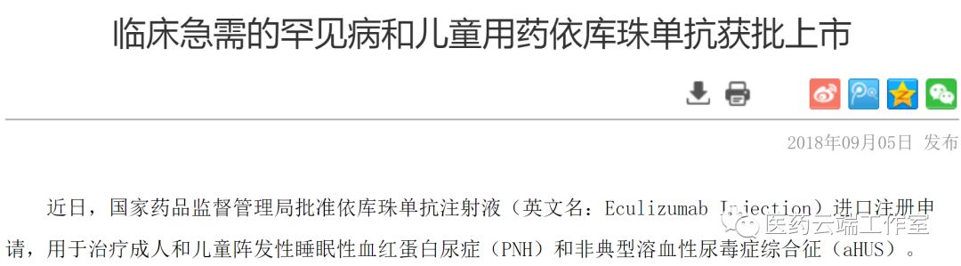 9月5日,国家药监局发布消息,依库珠单抗注射液(英文通用名:Eculizumab Injection,英文商品名:Soliris)获批上市。