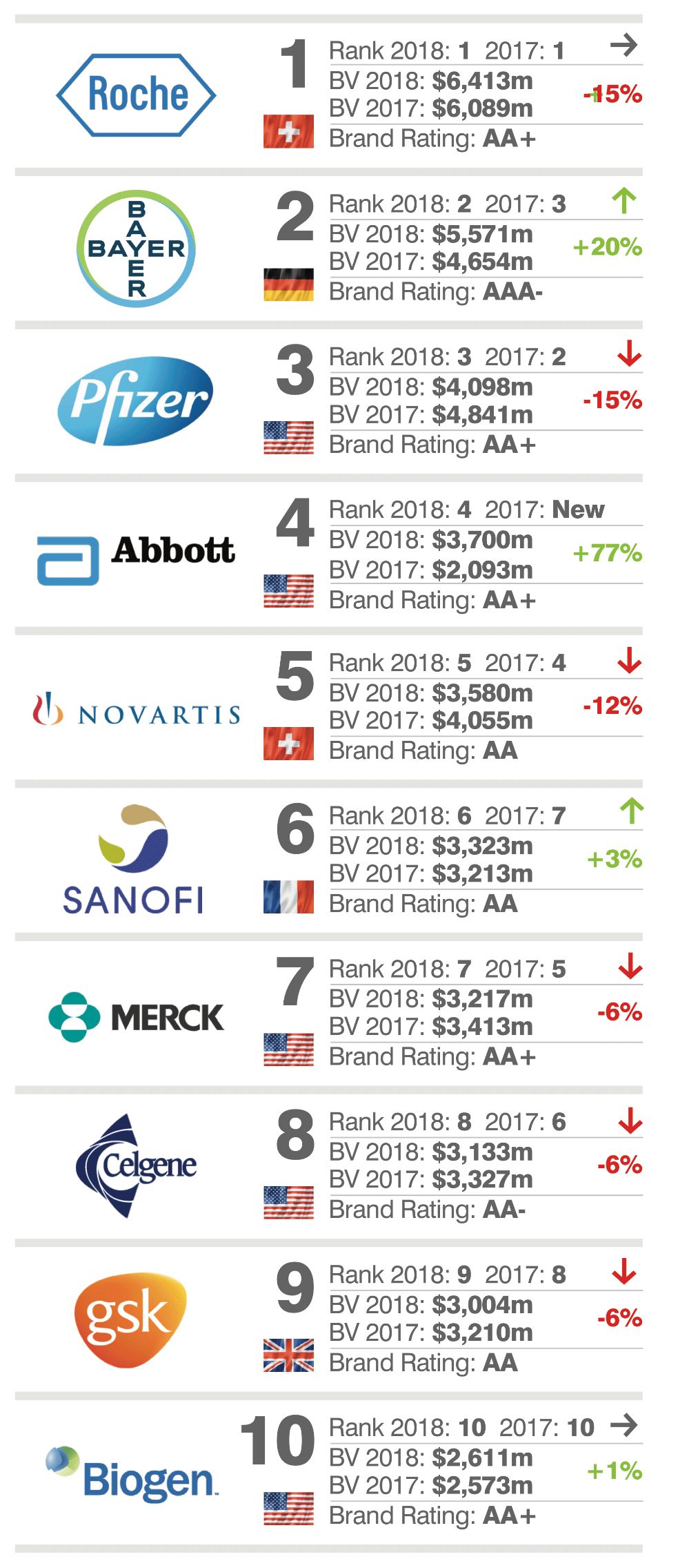 英国咨询机构 Brand Finance 在今年5月份发布了2018年全球制药企业品牌价值10强排名(见MRCLUB历史消息:2018全球制药企业品牌价值榜10强!),上月底正式发布了详细报告(可点击「阅读原文」下载),综合排名的前三为罗氏、拜耳、辉瑞,具体如下:
