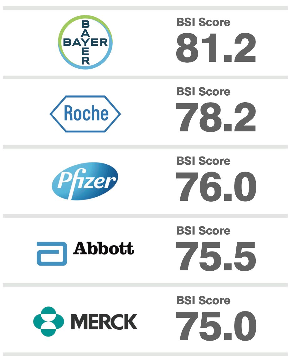 下图为制药企业的BSI排名及得分情况,前五分别为拜耳、罗氏、辉瑞、雅培、默沙东。