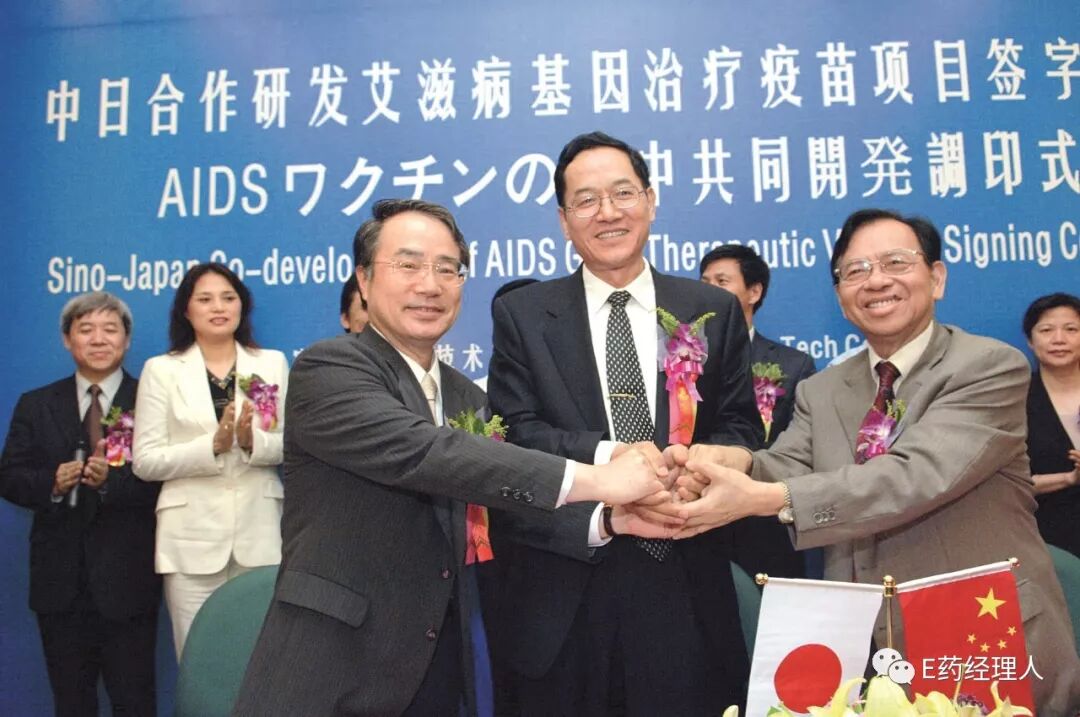 2007年5月25日,“中日合作研发艾滋病基因治疗疫苗项目”签字仪式在深圳五洲宾馆举行,前排左二为原深圳赛百诺基因技术有限公司董事长彭朝晖