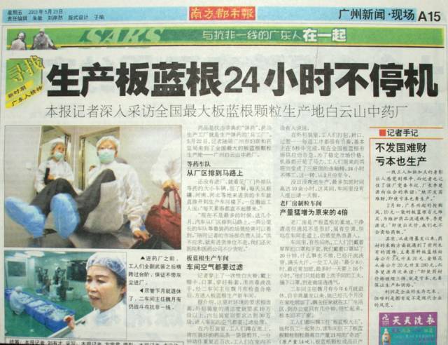 2003年,非典爆发,钟南山在医疗最前线救死扶伤,积极奔赴各疫区指导开展医疗工作,带领着无数医护工作者共同谱写了一曲可歌可泣的“抗非”壮歌。钟南山也一战成名,成为了家喻户晓的“抗非”英雄。在“非典”的特殊时期,还有一种已经使用了2000多年的中药——板蓝根,也因变成了预防“非典”的稀缺资源而家喻户晓。而尤其白云山牌板蓝根更是一举成名。当时,人们把做出了卓越贡献的钟南山院士和白云山(板蓝根),与王岐山、小汤山并称为抗非典“四座大山”!