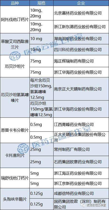 而降脂药阿托伐他汀钙片和瑞舒伐他汀钙片,降压药厄贝沙坦片、厄贝沙坦氢氯噻嗪片和卡托普利片,肝病用药恩替卡韦分散片,抑郁症用药草酸艾司西酞普兰片以及抗感染用药头孢呋辛酯片,这些品种目前均已有两个厂家通过一致性评价,未来谁将会成为第六个形成“三足鼎立”的品种?