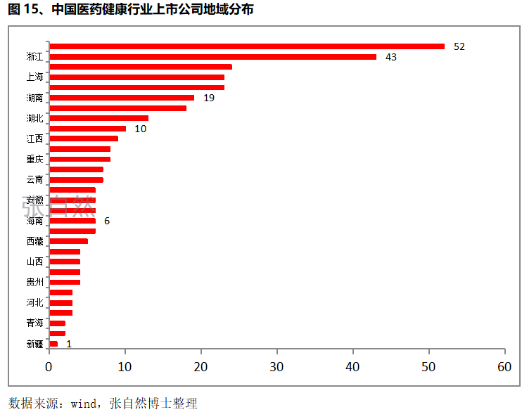 和整体经济表现相似,位于珠江三角洲的广东、长江三角洲的浙江江苏上海以及位于渤海经济圈的北京是医药上市公司最多的地区。
