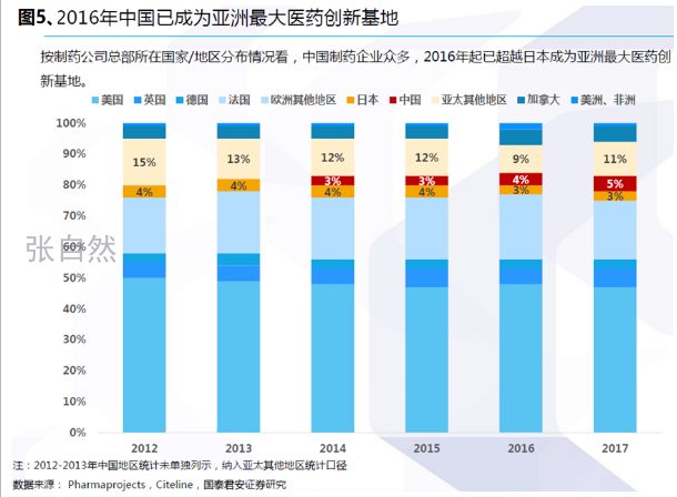 2016年中国即已成为亚洲最大的医药创新基地(图5),据Pharmaprojects统计,截止2018年1月,全球有新药研发的医药企业共4134家(按总部所在国家/地区划分),其中,中国拥有新药研发企业的数量和加拿大并列第3位,占5%(图6)。