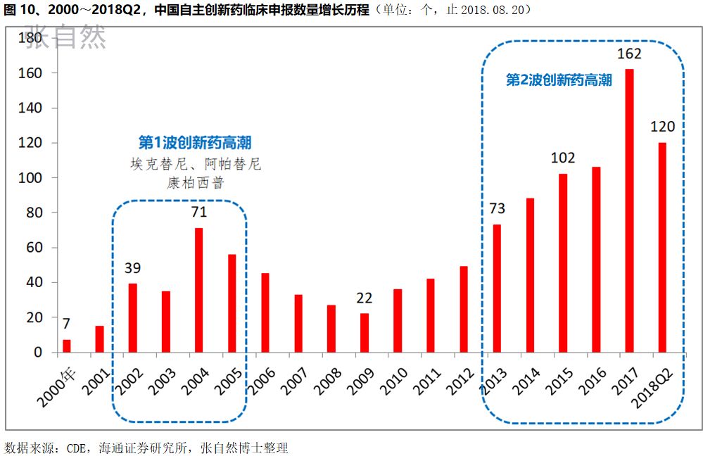 纵观中国自主创新药的研发,大约经历了两个重要阶段,一是以埃克替尼、阿帕替尼和康柏西普等研发为代表的2002~2005年,二是自2013年开始尤其从2015年8月国务院发布44号文以来,中国自主创新药临床申报数量大幅上升。