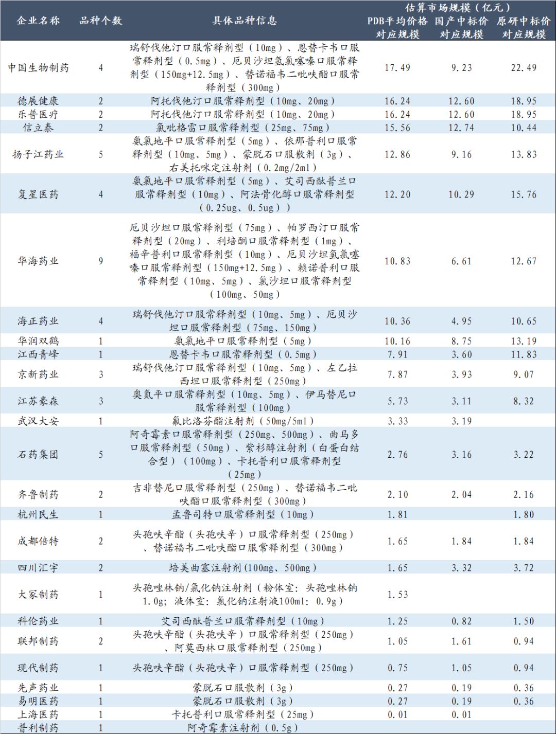 5、从企业维度看,此次试点可能涉及华海药业9个品种(以通用名和规格计),数量最多;涉及品种对应的PDB估算市场规模,中国生物制药最大,约17.49亿元(如果该企业有试点品种通过评价,则加上该品种的市场规模)。