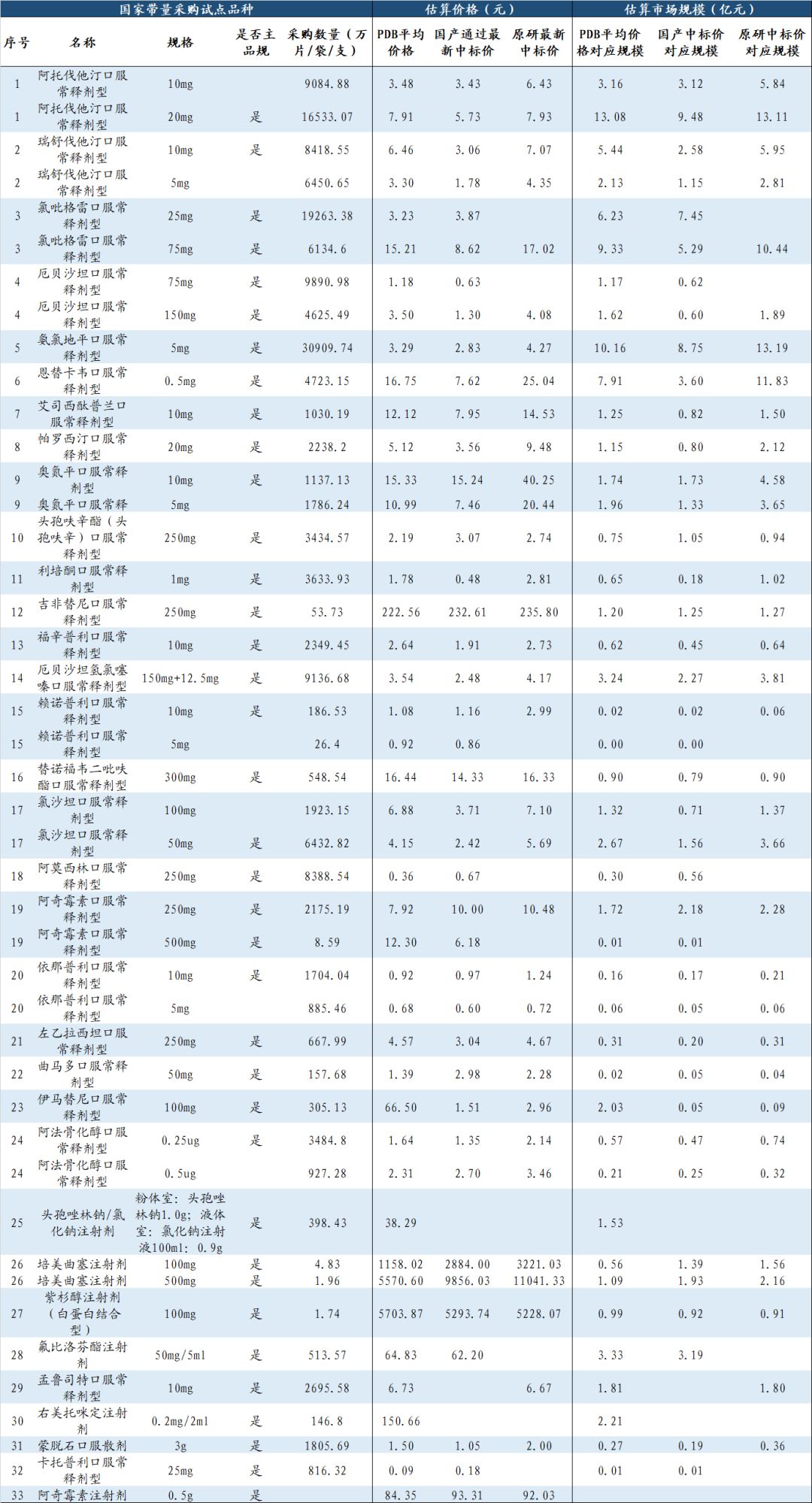 4、根据带量采购数量和样本医院2017年平均价格计算,前5五大品种分别是:阿托伐他汀(20mg,13亿)、氨氯地平片(5mg,10亿)、氯吡格雷(75mg,9亿)、恩替卡韦(0.5mg,9亿)、氯吡格雷(25mg,6亿);以通过企业的最新中标价或以原研企业的最新中标价估计,结论相差不大。